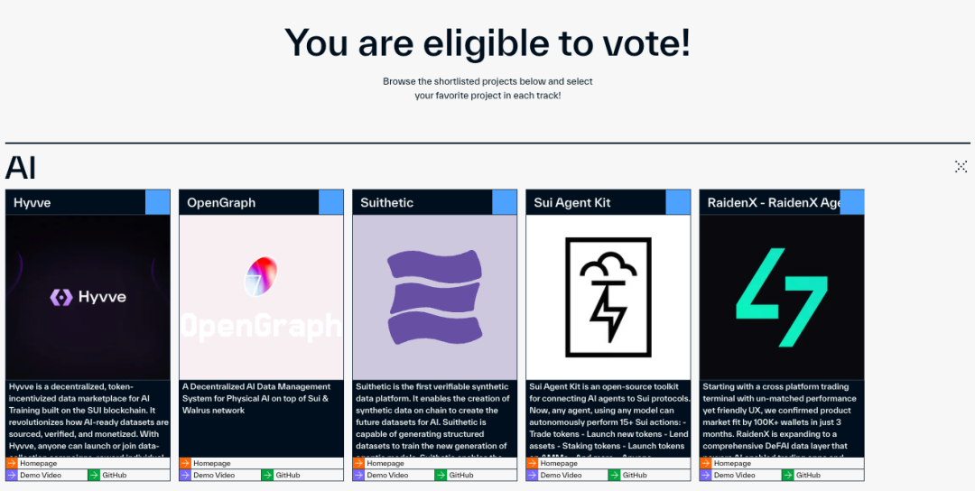 Sui Overflow 2025 是 Sui 生态最重要的开发盛会之一,涵盖了 9 个主要赛道,每一位参与者都为构建链上未来贡献了无限创意。而最终的获奖项目评选,也将结合社区投票结果!